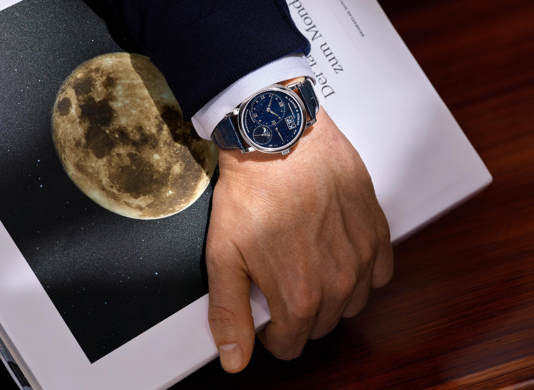 Functionally, it’s familiar – the time with a subsidiary seconds, power reserve indicator, the Lange outsize date, and a moon phase. The hands are rhodium-treated gold.