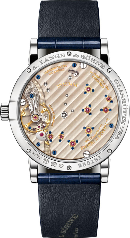 Visible through the open case back is the manually-wound Calibre L121.2 with a three-quarter plate in untreated German silver decorated in Glashütte ribbing, the famed Lange hand-engraved balance cock, and the gold chatons with blue steeled screws. Beating at 21,600 VPH, it has a power reserve of 72 hours.
