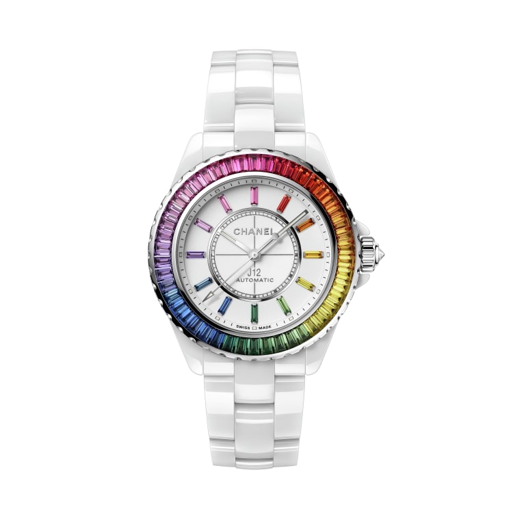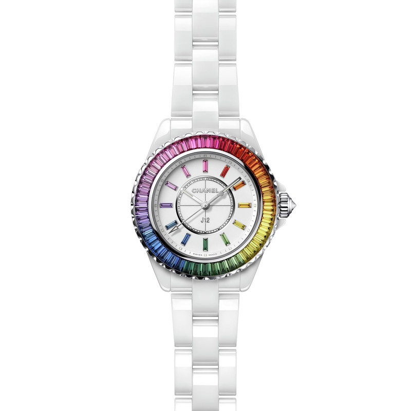 Next up, the limited edition J12 Electro Dream, is in either black or white ceramic, combining the twelve colours in gradation of sapphires on the bezel. This is echoed on the dial by 12 baguette-cut markers.