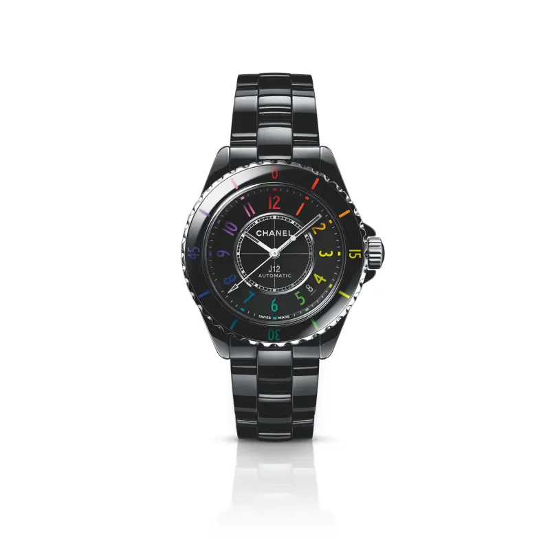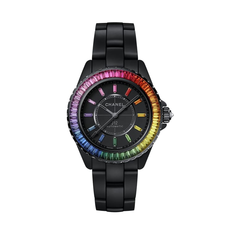 The black one is is ceramic and steel with black ADLC treatment, as is the bracelet, which has a triple-folding buckle. The bezel is steel and set with 46 baguette-cut rainbow sapphires for a total of ~6.47 carats. The matte black dial is set with twelve baguette-cut rainbow sapphires (~0.47 carat) and the steel crown has one brilliant-cut diamond (~0.14 carat). Inside is the automatic COSC-certified Calibre 12.1, familiar from other J12s, which beats at 28,800 VPH and has a power reserve of 70 hours.