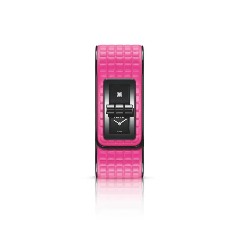 Limited to 255 pieces, this statement wrist accessory is a neon pink quilted calfskin leather cuff with black trim and lining. The dial is black lacquer and divided into two squares – one for the time and the other set with a princess-cut diamond (~0.05 carat). The design is based on the clasp of the 2.55 handbag, with the middle portion representing the bag’s clasp. It measures 39.3mm x 25.0mm x 8.8 mm, and the case is steel with black ADLC treatment.