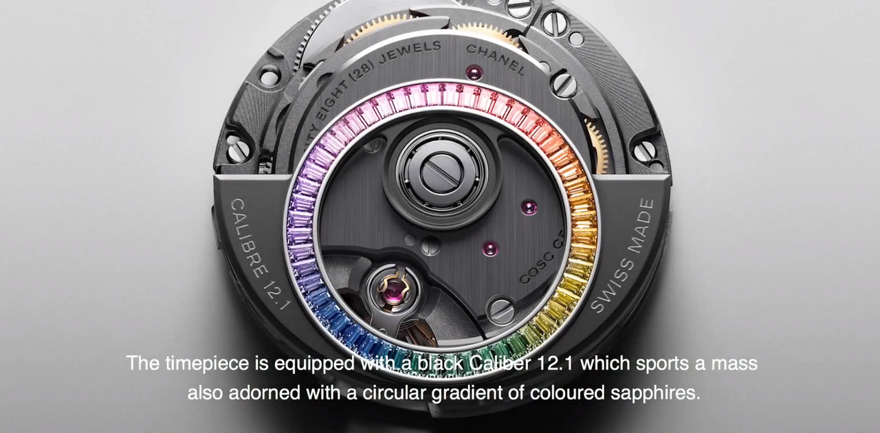 If that wasn’t enough, the automatic COSC-certified Calibre 12.1 (with a power reserve of 70 hours) inside has a black oscillating weight set with 52 baguette-cut rainbow sapphires (~0.46 carat).