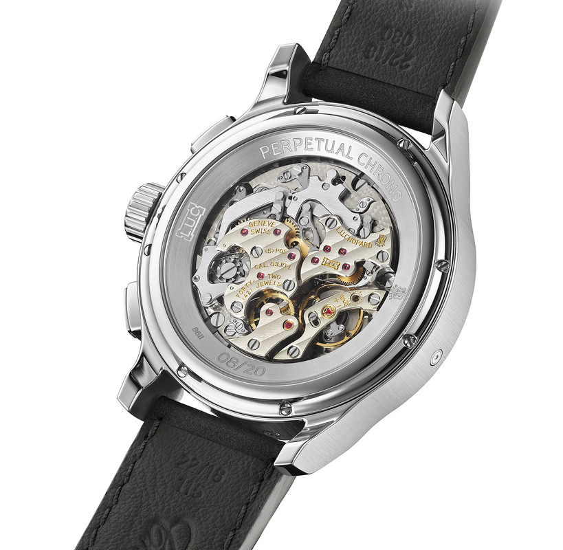 Beneath the open case back can be seen the manually wound COSC-certified Chopard in-house Calibre L.U.C. 03.10-L which beats at 28,800VPH and has a power reserve of 60 hours. It features a patented perpetual calendar and an integrated column-wheel chronograph with a patented ‘return-to-zero’ reset system for the counters and sweep seconds hand via a vertical coupling clutch. Finishing-wise there’s nickel silver main plate and bridges and Côtes de Genève.