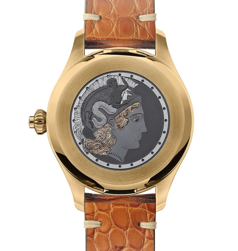 The relief image of Minerva is achieved in a similar way that has been used by Montblanc before – lasering is used to engrave, texture, and notably colour (through oxidation). The angle, distance between the titanium plate and the laser, and the length of the application are what achieves these different colours. We were told by Laurent Lecamp during the press session that Montblanc’s ability to ‘colour by laser’ on such a large surface is the exception rather than the rule amongst Swiss watch brands.