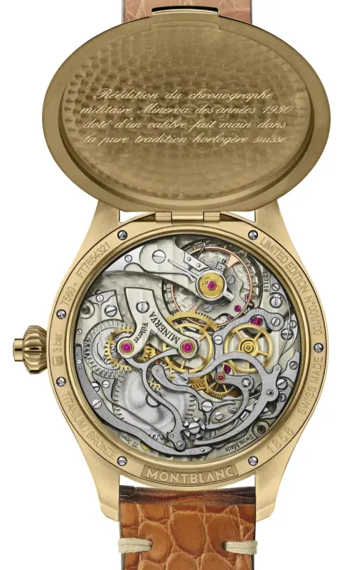 As well as the case back there’s a bronze-coated titanium officer case back with Minerva engraved on both sides and the inscription “Ré-édition du chronographe militaire Minerva des années 1930 doté d’un Calibre fait main dans la pure tradition horlogère suisse” on the inside.