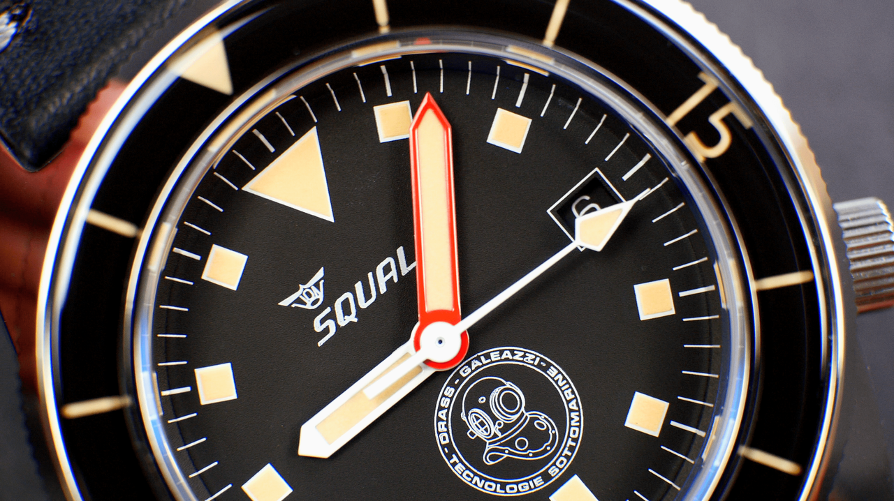 Beneath the 4mm thick sapphire crystal is a matte black dial with square hour markers and broad hands, with the minute hand in orange. The double-signed dial features the Squale logo at 12 o’clock and the diver’s helmet Galeazzi logo at 6 o’clock with the company’s full trading name “DRASS GALEAZZI TECNOLOGIE SOTTOMARINE” (submarine technologies). This logo also appears on the screw-down case back, along with the serial number xxx/500.