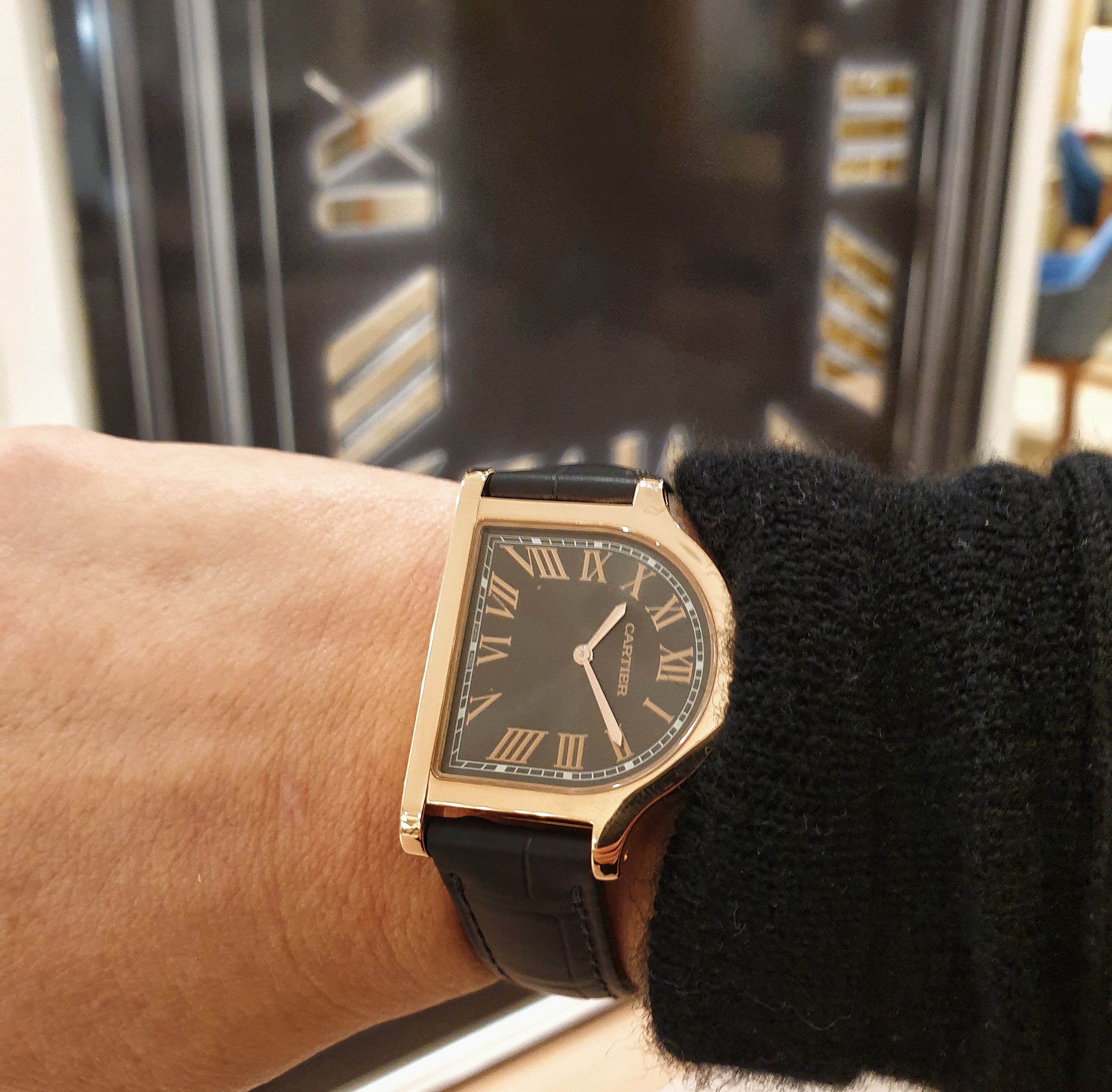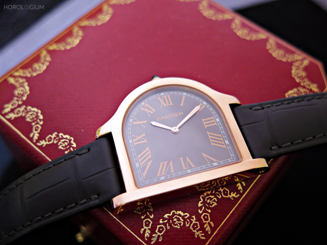 The cloche shape first appeared in Cartier pieces in 1920. The “Cloche de Cartier” name was chosen because when when oriented horizontally, its outline was like a bell. This first Cloche was a diamond and onyx brooch watch. The case shape’s inaugural appearance in wristwatch form was in the following year, courtesy of a platinum and diamond number, followed by the first Cloche de Cartier wristwatch in yellow gold with a leather strap in 1922.