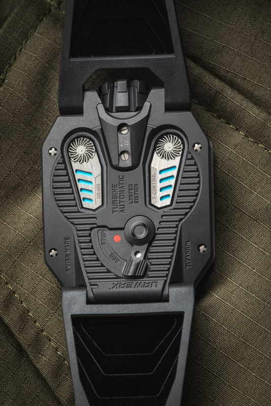 Powering the Tantalum Hull is the automatic Calibre UR 5.03 with the winding system, regulated by twin pneumatic turbines visible at the back. This can be adjusted by the wearer, using a small lever. When in the FULL position, wrist movement will rewind the barrel spring. Turning it to STOP disengages the self-winding system, and the watch can be manually wound using the crown. An intermediate position, RED (for reduced), minimises excessive wear and tension by engaging the turbines to dampen the winding rotor and avoid over stressing the mainspring if the wearer is physically active.