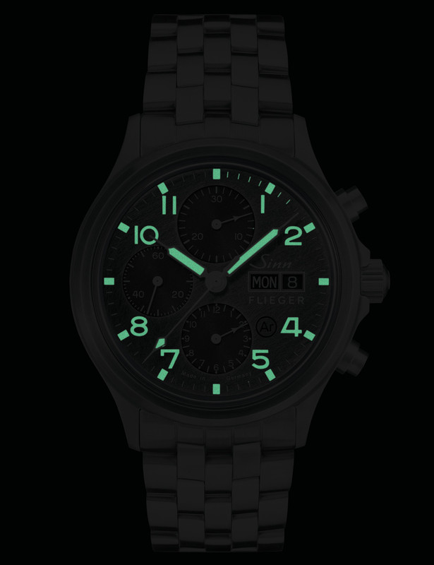 The key aspects of the watch will be familiar to many of you – the stainless steel case is 42mm with a thickness of 15mm. It has a screw-down crown and is water resistant to 10m. The functions are also clear on the dial – along with the time and chronograph functions there are date and day of the week display. SINN’s Ar-Dehumidifying Technology is also present, as shown by the ‘Ar’ on the dial. The numbers and indices are all lumed.