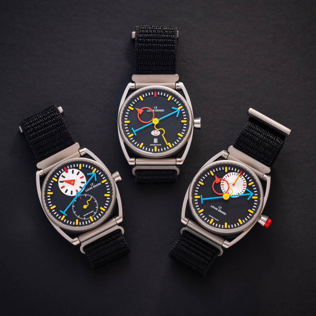 As was the case with the Louis Erard x Alain Silberstein Le Régulateur of 2019, the dials of these 2021 editions is matte black and features Silberstein’s signature bright red, yellow, and blue colours and his triangle, circle, and rectangle-shaped hands and indices. His predilection for primary colours and shapes mean that anything with his touch is immediately recognisable.