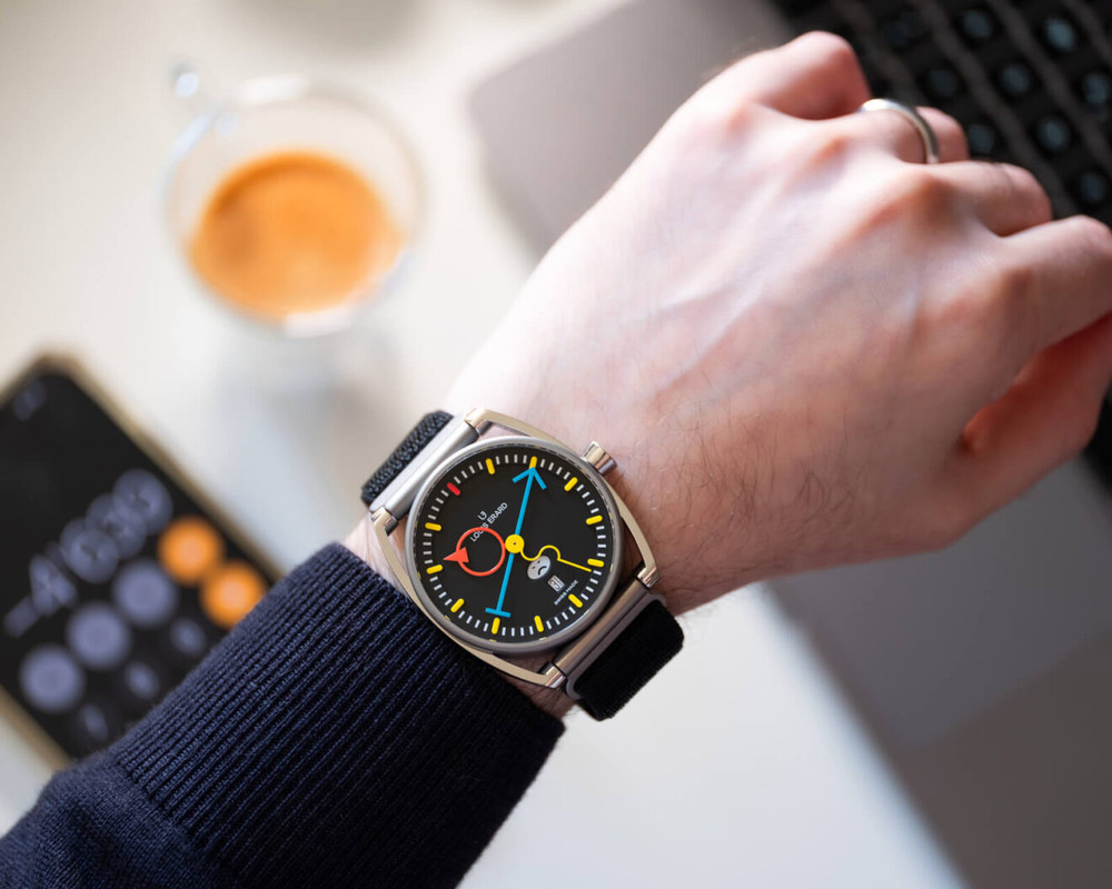 The Le Régulateur Louis Erard x Alain Silberstein is, as mentioned, the second time Silberstein has played with this model, and it has a large blue arrow hand for the minutes, a red triangle for the hours, and a small yellow serpentine hand for the seconds. Compared with the first Louis Erard x Alain Silberstein Le Régulateur this revamp, particularly with the new case, feels a lot more fresh and modern.