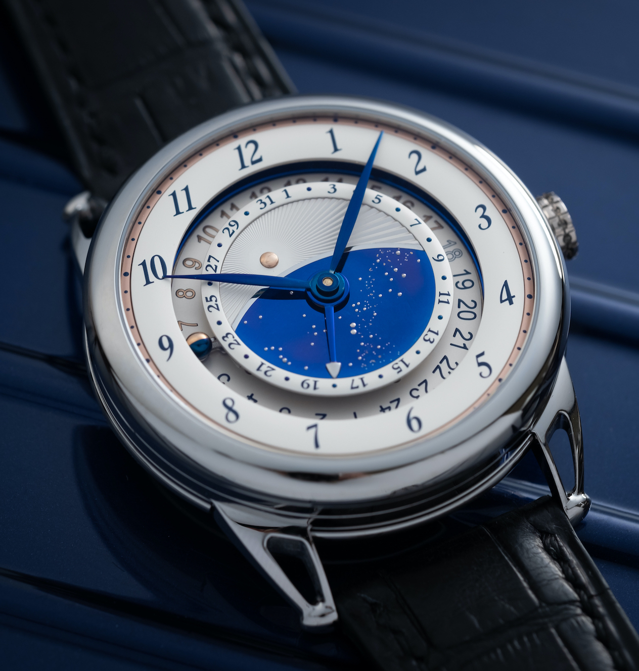Going into the finishing and design details of the (curved) dial and its functions, the silver-toned date ring is curved and the blued markers are positive. The silver hour ring is also curved. The minute ring is rose gold. The 24-hour dial has two-toned decals. The classic De Bethune micro sphere has a day/ night indicator for that time zone in two halves that are blue and pink.