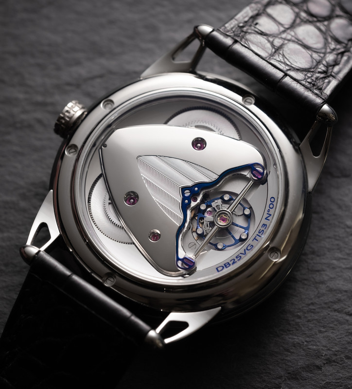 Visible through the sapphire case back is the new manually-wound Calibre DB2507, beating at 28,800 VPH and with a power reserve of five days. It features the usual attributes of a De Bethune movement – an in-house balance spring, silicon escape wheel, a triple para-chute shock absorbing system, balance spring with the “De Bethune” flat terminal curve, and a titanium balance wheel with white gold inlays.