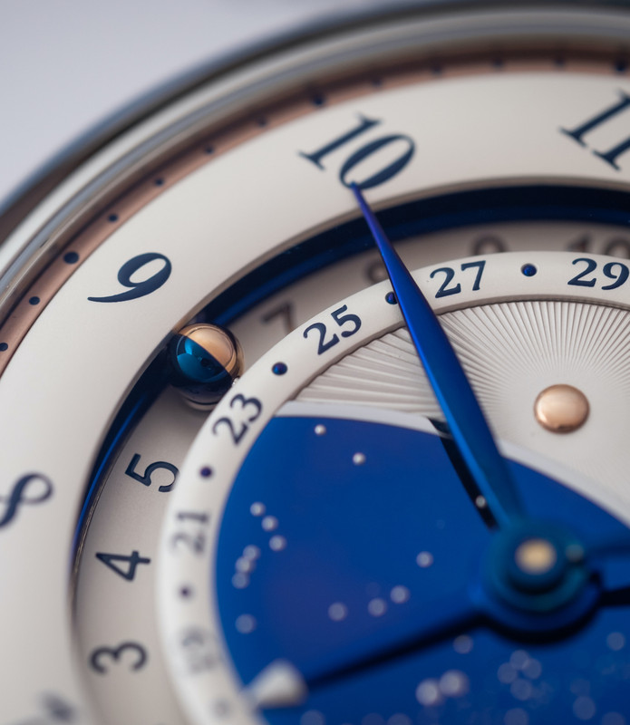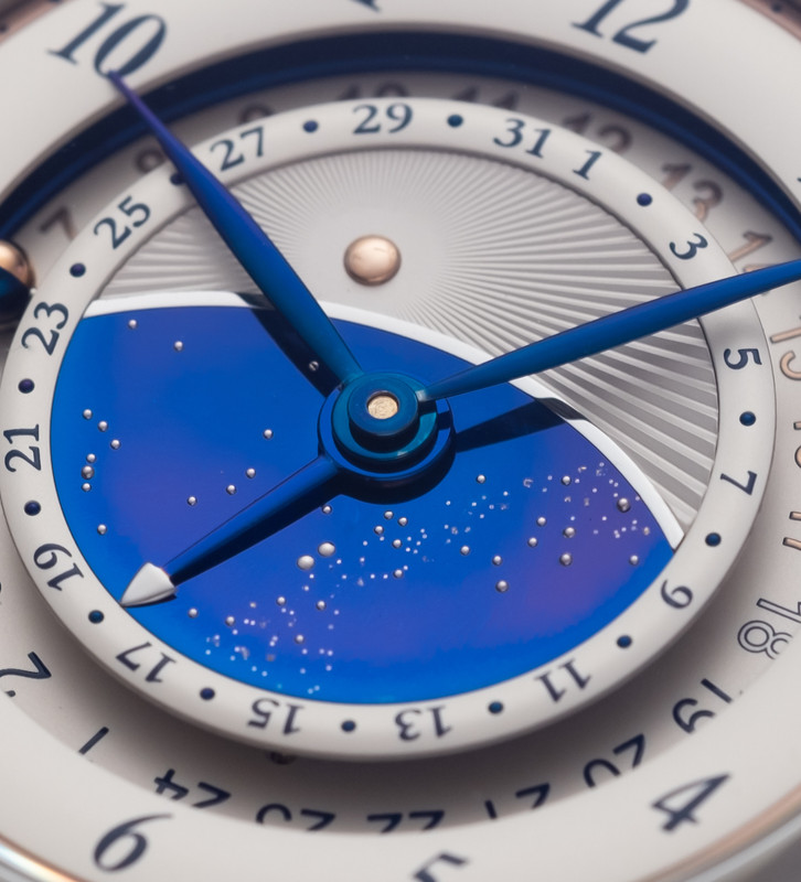 In the centre is the influence of the Starry Varius on this new model’s day/ night indicator. With blued polished titanium with white gold pins for the night sky for Milky Way half of the disc, the other half has a polished pink gold sun and silver micro light decoration.