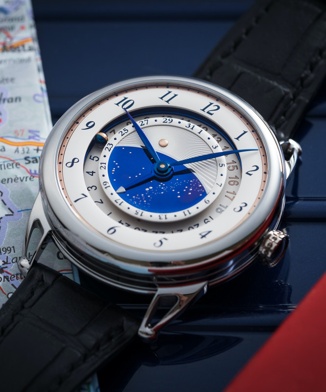 The local time, i.e. the second time zone, is indicated by blued hands whose curvature follows the relief of the dial. The minutes is synced with the reference time and the local (second) time can also be set by the crown, in both directions.