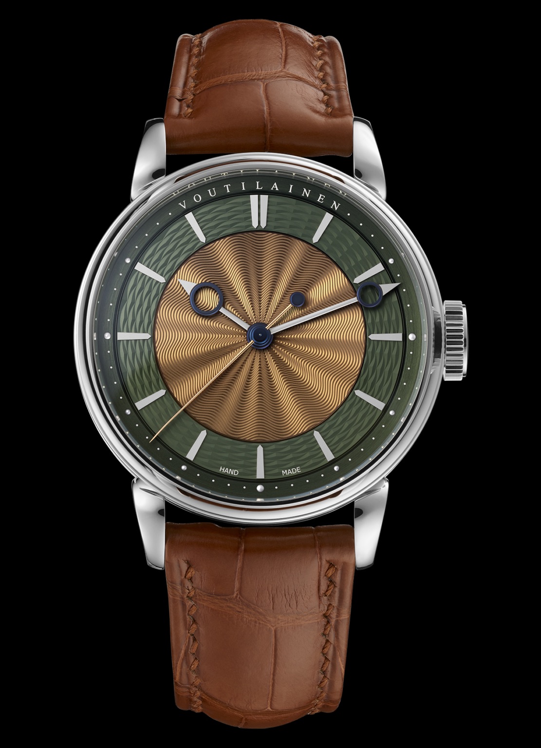 The engine-turned in-house dial (made by Voutilianen’s Comblémine) is silver and classic Voutilainen – two colours with two types of guillochage. The applied numerals are gold, and the hands are made from gold and steel finished and polished by hand.