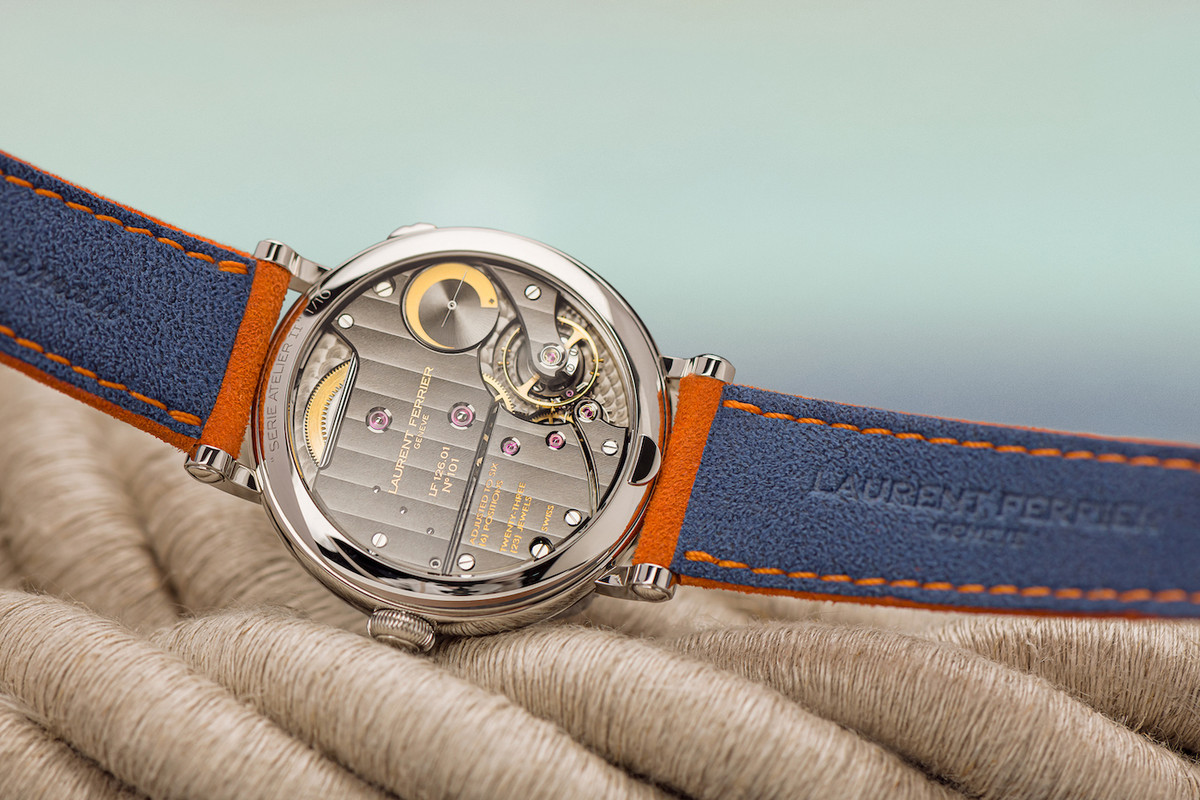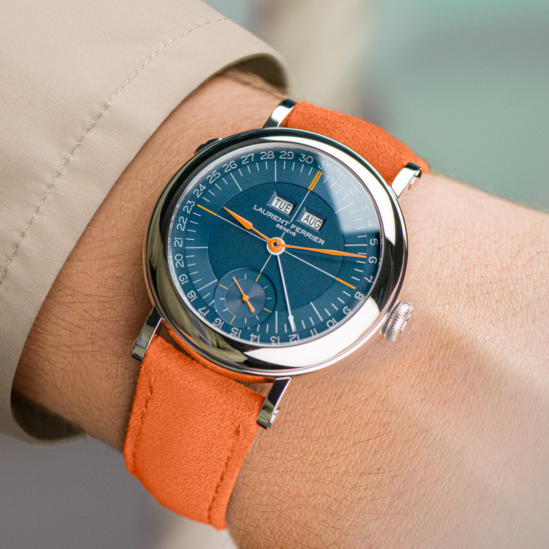 Laurent Ferrier has revisited his École Annual Calendar, this time in navy blue and orange. This new variant is numbered, engraved as “Série Atelier II”, and is in a limited edition of ten pieces. In this latest iteration, the 40mm case is in stainless steel with a water resistance of 30m and sapphire crystal on both sides.