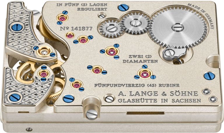 The in-house three-part dial is made of solid white gold. The inner section with the Lange outsize date is manually engraved with a lozenge pattern, a design pattern mirrored in the six lozenge-shaped gold hour markers. The dial is coated with semi-transparent enamel.