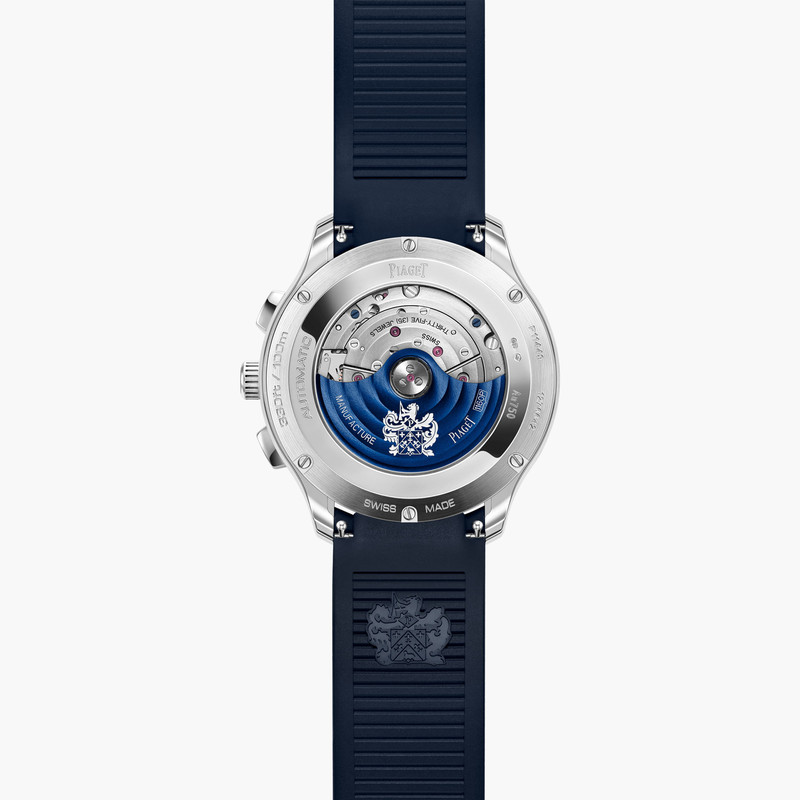 It is all powered by Piaget’s automatic 1160P column wheel chronograph movement (called the 1160 Blue in this instance, referring to the coloring of the rotor), beating at 28,800 VPH and with a power reserve of 50 hours. With a thickness of 5.72mm, its finishing includes Côtes de Genève, a circular-grained mainplate, and bevelled bridges. The blue rotor is engraved with the Piaget coat of arms, and the screws are blued as well.
