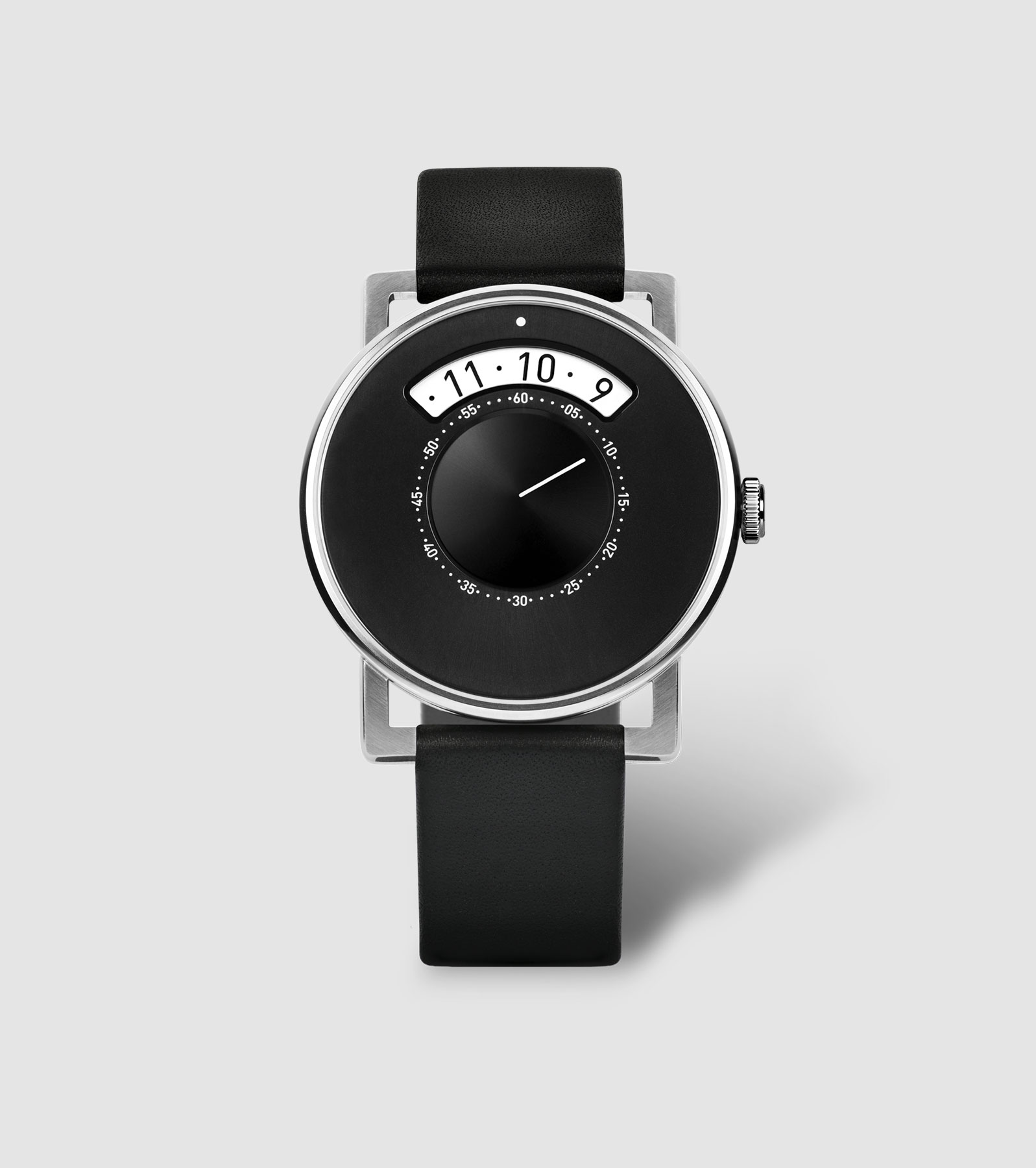 The black dial is nickel-plated with a sunburst effect. The hour disc is rhodium-plated and the domed minute disk disc is also black nickel-plated with a sunburst effect to blend in with the rest of the dial side.