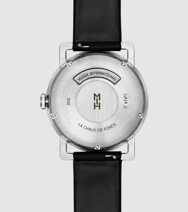 Designed by Atelier XJC/ Xavier Perrenoud, the MIH Gaïa is made with nine watch industry suppliers from the area around La Choux-de-Fonds. Their contributions include an automatic SW400-1 movement via Sellita, a stainless steel case from Stila SA, a display from Jean Singer & Cie., sapphire from Arunic®, calf strap from Brasport SA, and a clasp from Cornu & Cie.
