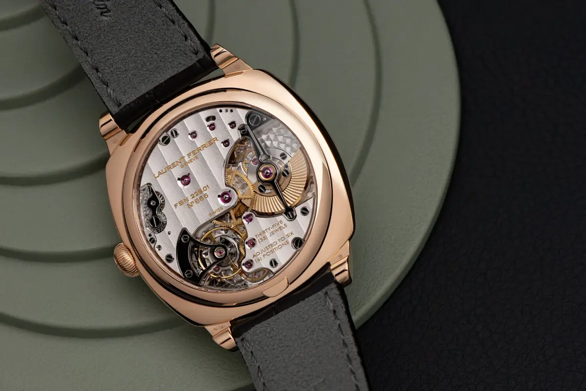 Visible through the open case back is the automatic Laurent Ferrier in-house Calibre FBN 229.01, which beats at 21,600 VPH and has a power reserve of 72 hours. It features a unidirectional pawl-fitted micro-rotor and a silicon escapement featuring a double direct impulse on the balance.
