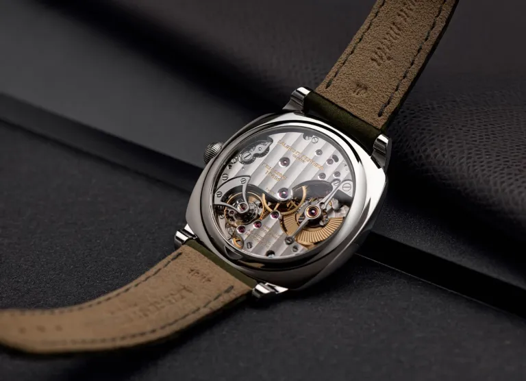 The new Laurent Ferrier Square Micro-Rotor Retro comes on either a hand-sewn dark grey or khaki velvet alligator leather strap, with Alcantara lining and a pin buckle in stainless steel or 18kt red gold.