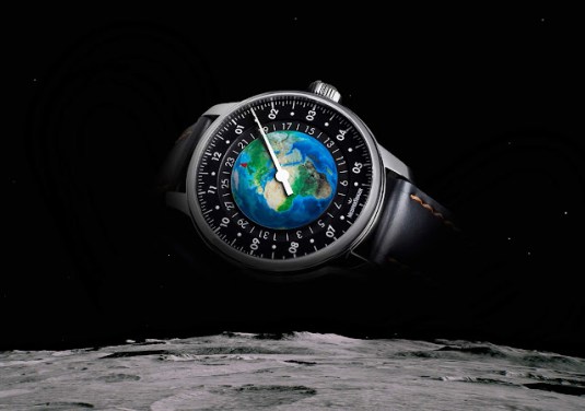 The jet black dial also features a circular 360° open date disc in the form of a concentric ring rotates around a photo-realistic representation of the Earth, advancing each day at midnight, with the current date just below 12 o’clock by a small red arrow.