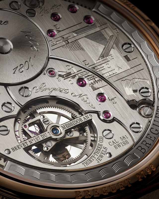 The new timepiece has a 60-second tourbillon between 4 and 6 o’clock, which doubles as a small seconds. It has a special anniversary blued steel tourbillon bridge, and an accompanying “Brevet No 157” engraving, a reference to the patent number awarded to Abraham-Louis Breguet for his tourbillon. The movement also has a reproduction of the original watercolor plate that was used by Abraham-Louis Breguet when he was filing his patent application for the tourbillon regulator.