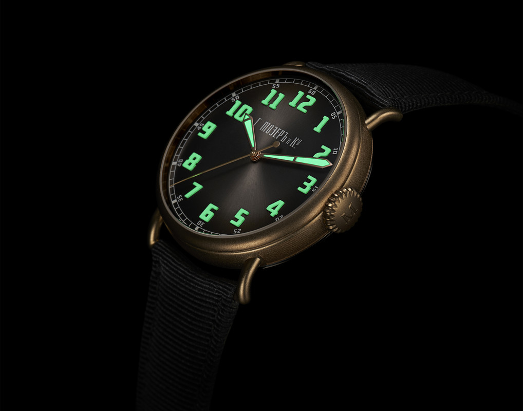 This new iteration brings a 42mm sized bronze case into the picture, but also adds an unexpected touch to the black fumé sunburst-patterned dial – the brand’s logo in Cyrillic logo. This is not some region-specific nod but a font and style that was used by Heinrich Moser.