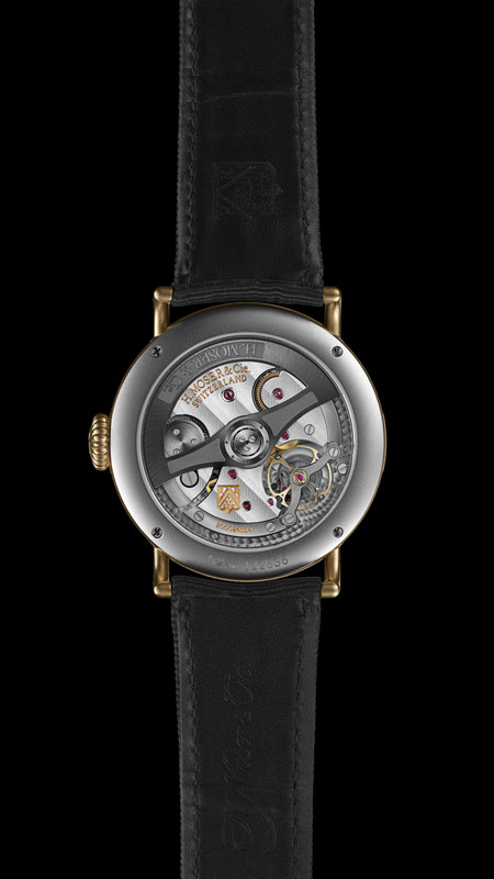 Visible behind the sapphire and steel case back is the automatic Calibre HMC 200. With an engraved oscillating weight and decorated with the Moser double stripes, it beats at 21,600VPH and has a power reserve of three days.