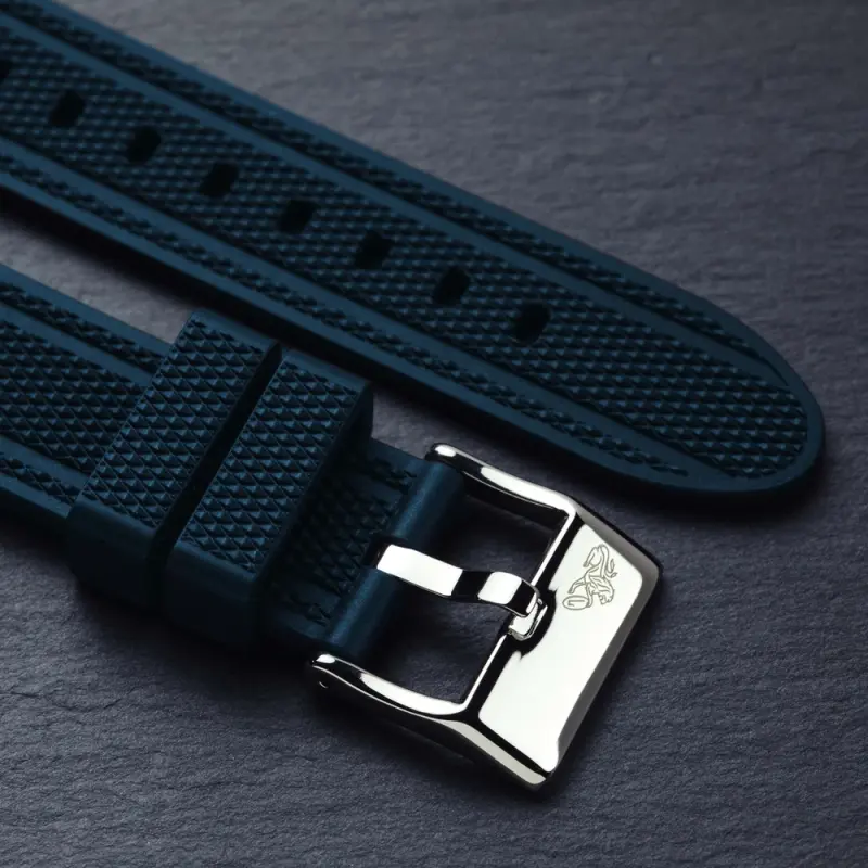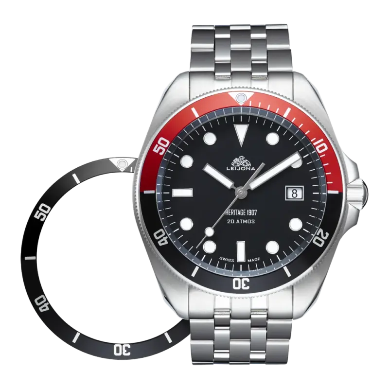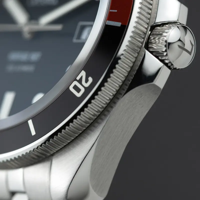 The 41mm (Swiss made) stainless steel case has a thickness of 12.75mm with a screw-down crown, a screw-down case back with an engraved Leijona logo, and a water resistance of 200m. The cases are hand-finished and the watches assembled, at Voutilainen & Cattin SA.