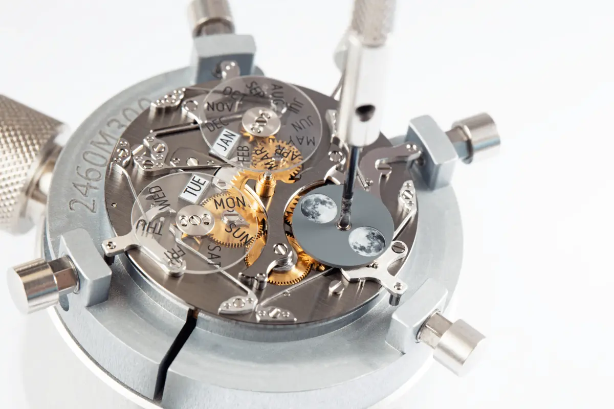 Alongside the hours and minutes is the day of the week in an aperture on the top left, the month in a similar aperture on the top right, and in addition to the triple calendar, a moon phase at 6 o’clock. The moon phase’s discs have photo realistic depictions of Earth transfers, and are covered with sapphire.