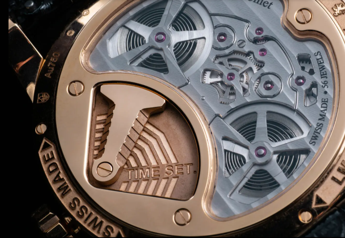 As mentioned, there are two one minute tourbillons (and their 18K gold counterweights, which weigh 0.4g) rotating around the dial in opposite directions. They cross paths 18 times per hour and are built on two different levels. Each tourbillon cage weighs 0.25g. There are five ball-bearing mechanisms with seven ceramic bearings, one ball-bearing mechanism with nin ceramic bearings, one barrel for each of the tourbillons, and all up, 471 components.