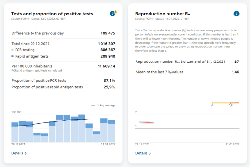 In terms of hospital capacity, according to the Federal Office of Public Health (FOPH) as of January 12, 2022 the occupancy of intensive care units is 75.5%, with COVID-19 patients 30.2%. The total hospital capacity of Switzerland is at 78.9% with COVID-19 patients being 7.8%.