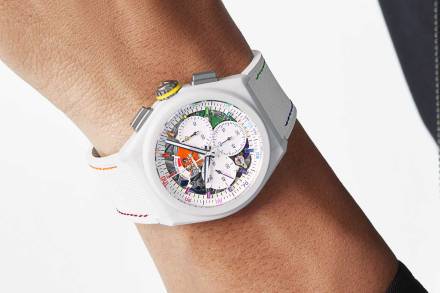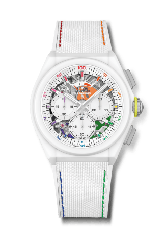 The white chronograph counters match the white case, but the use of colour even extends to the chronograph counter hands, with coloured tips. Each bridge of the movement is finished in a different metallic colour, again following the gradient of the dial’s markers.