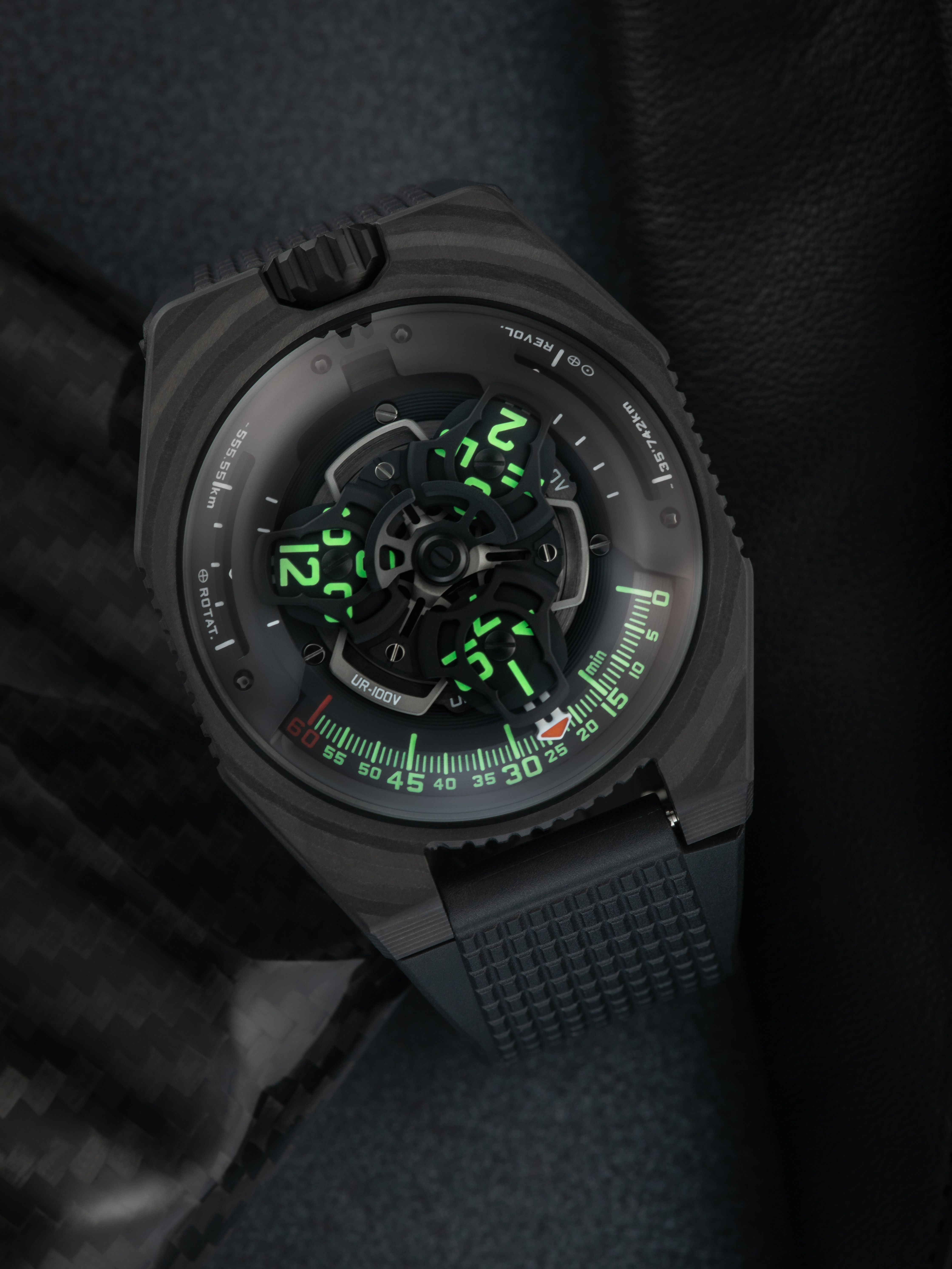 Coming on a textured black rubber strap with deployant buckle and in a limited edition of twenty-five pieces, the new UR-100V Carbon is priced at CHF 53,000.