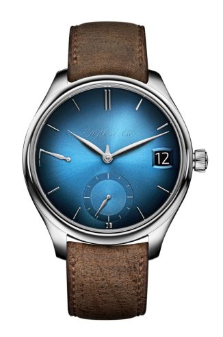 the Funky Blue fumé dial is enhanced by a sunburst pattern and white gold leaf-shaped hands and applied indices. The small seconds subdial is elegantly displayed at 6 o’clock.