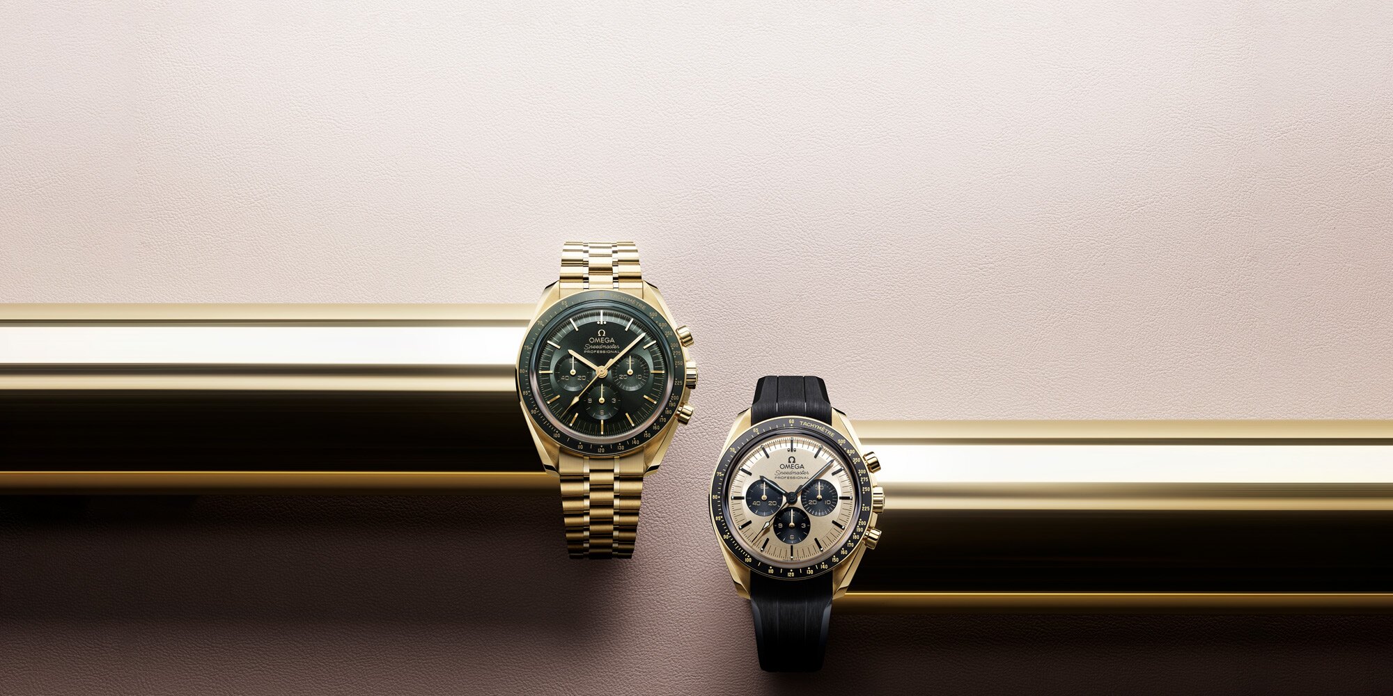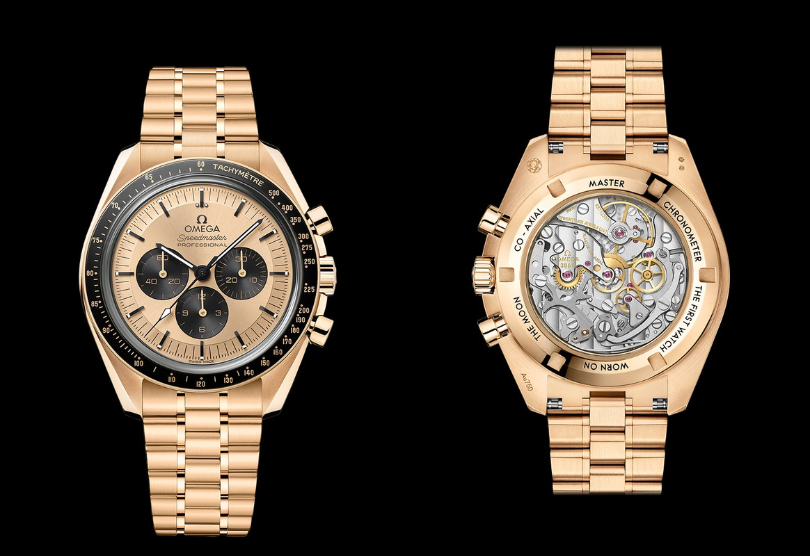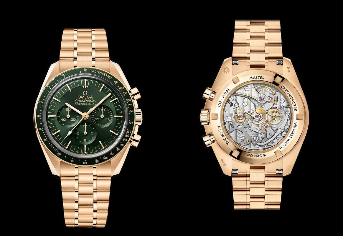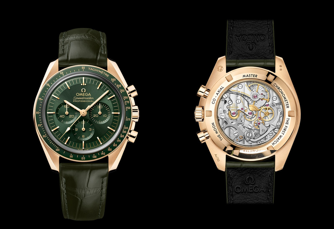 As mentioned, there are two dial variants – green PVD or sun-brushed 18kt Moonshine™ Gold. Both options have applied diamond-polished 18kt Moonshine™ Gold hour markers with Super-LumiNova. Transferred markings: “OMEGA”, “Speedmaster PROFESSIONAL”, minute track and “SWISS MADE” transferred in Moonshine Gold color.