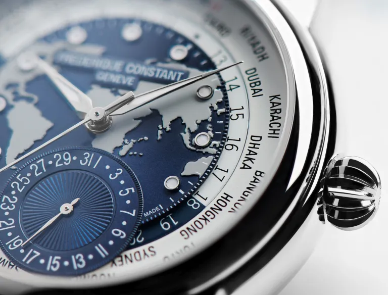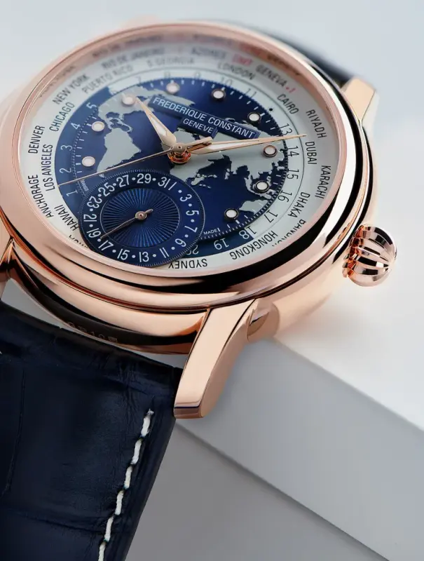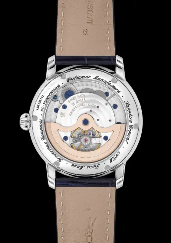 As with the other current and previous members of this Worldtimer family, it is powered by the automatic Calibre FC-718, which beats at 28,800 VPH and has a power reserve of 38 hours. Visible through the open case back, it has perlage and Côtes de Genève.
