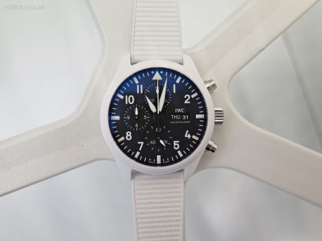 Now, in 2022, IWC is adding two new chronographs in white and green ceramic to the TOP GUN Pilot’s Watches collection – the TOP GUN Edition “Lake Tahoe” which has a white ceramic case, stainless steel pushers and crown, titanium case back, and a black dial with black lumed hands. The strap is white rubber strap with a folding clasp.