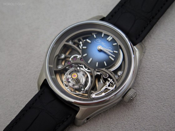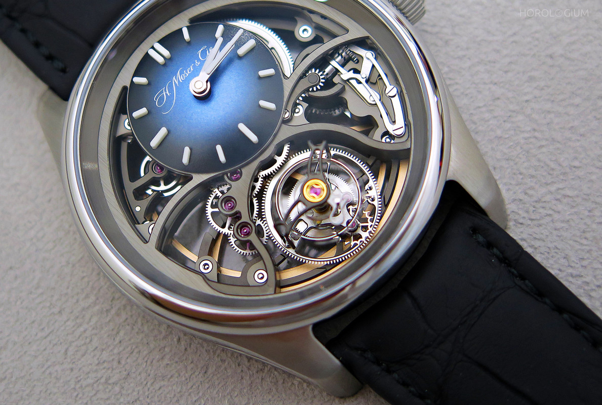 There is a one minute flying tourbillon with a cylindrical hairspring which dominates the dial side at 6 o’clock. The cylindrical hairspring is, as expected, made by H.Moser et Cie’s sister company Precision Engineering AG. Both the tourbillon cage and the balance bridge are skeletonised, with similar diamond beveling along every edge including the internal open-worked sections.