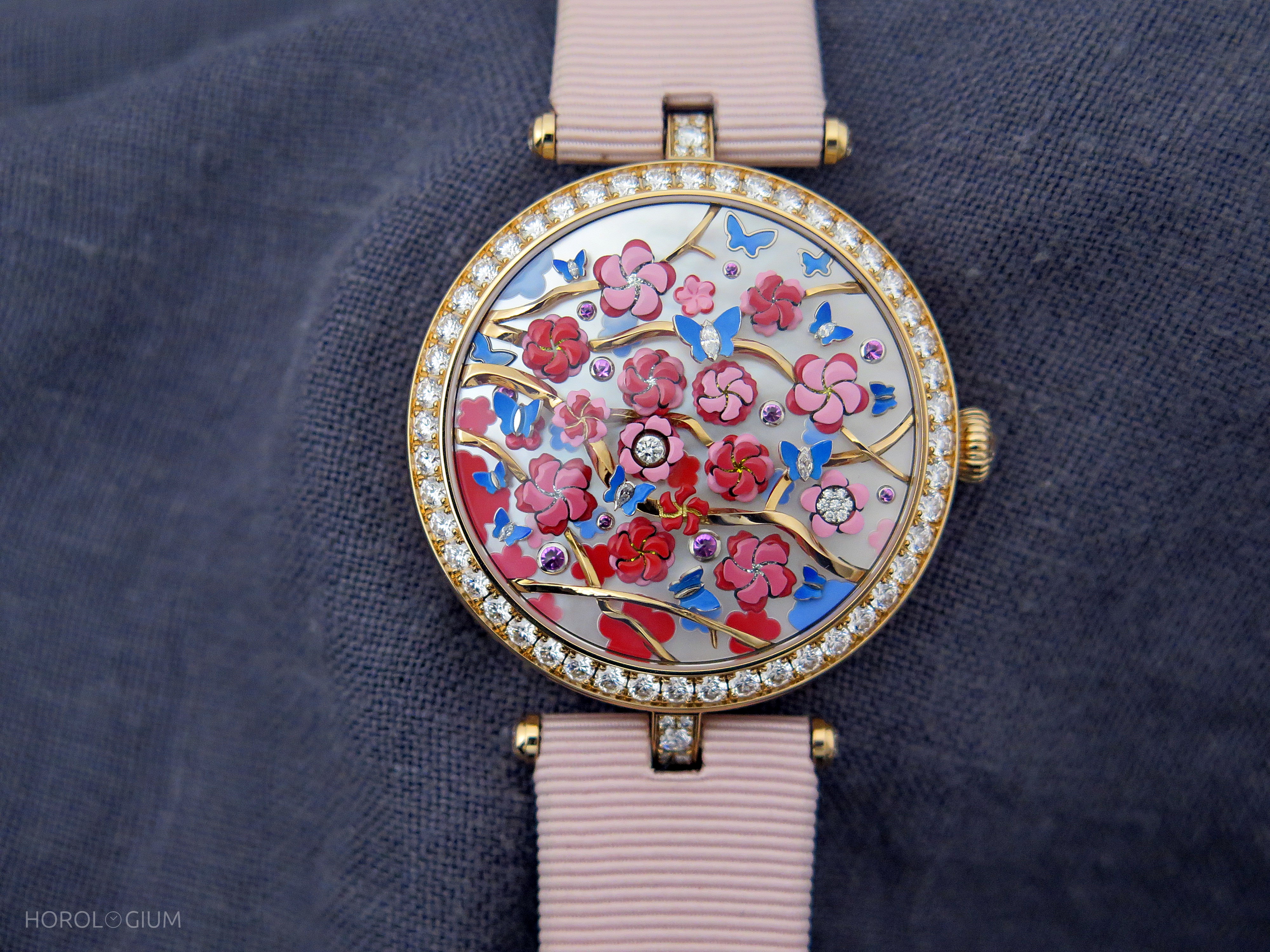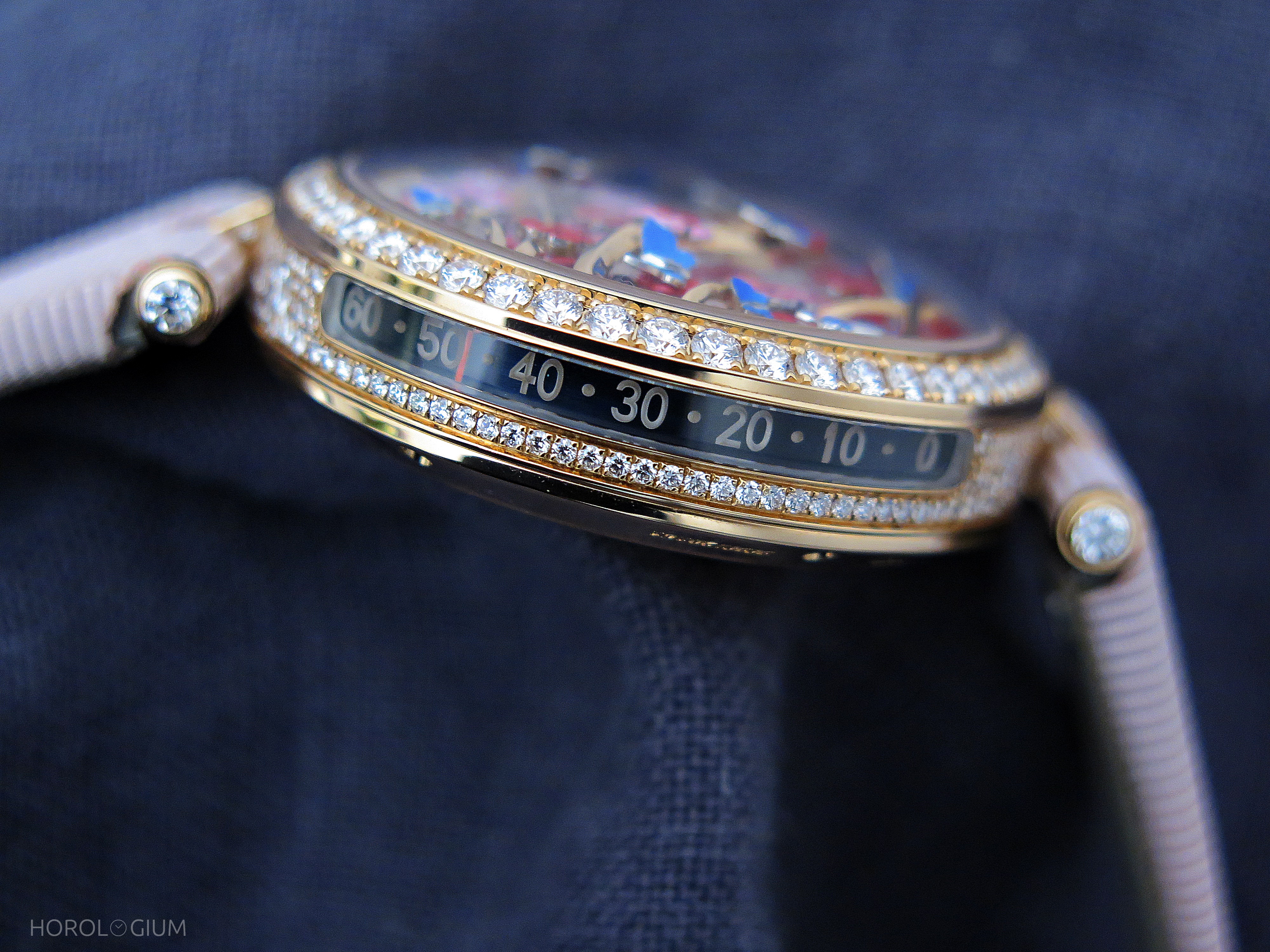 The Lady Arpels Heures Florales Cerisier is in a 38mm rose gold case with a rose gold bezel, and round diamonds.