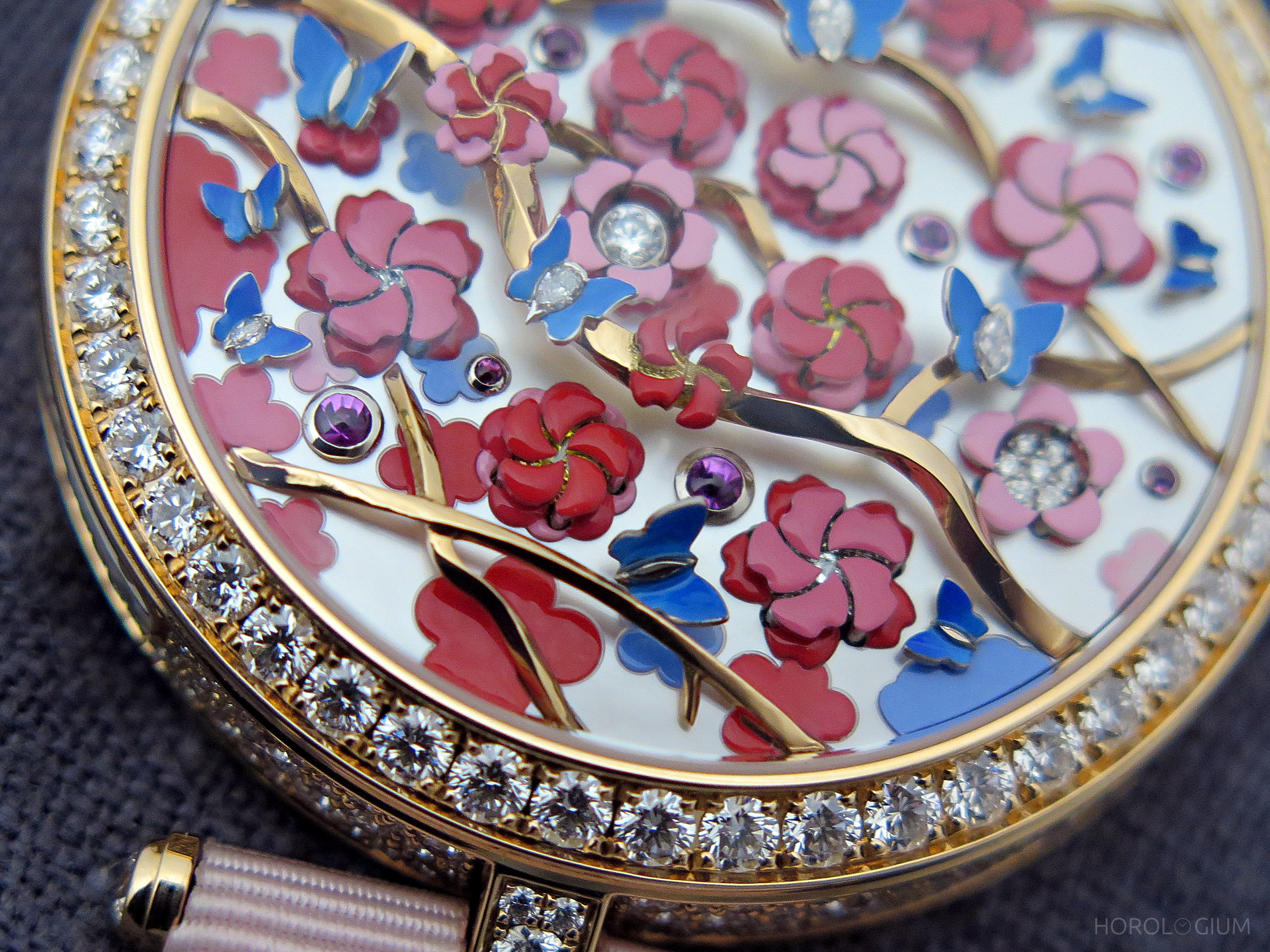 Its dial is in rose gold, white gold, yellow gold, has pink sapphires, yellow and white diamonds, white mother-of-pearl, miniature painting, round pink sapphires, mother-of-pearl marquetry, miniature painting; flowers in white gold, yellow gold, round yellow diamonds, with sculpted rose gold branches, butterflies in white gold, and navette and pear-shaped diamonds.
