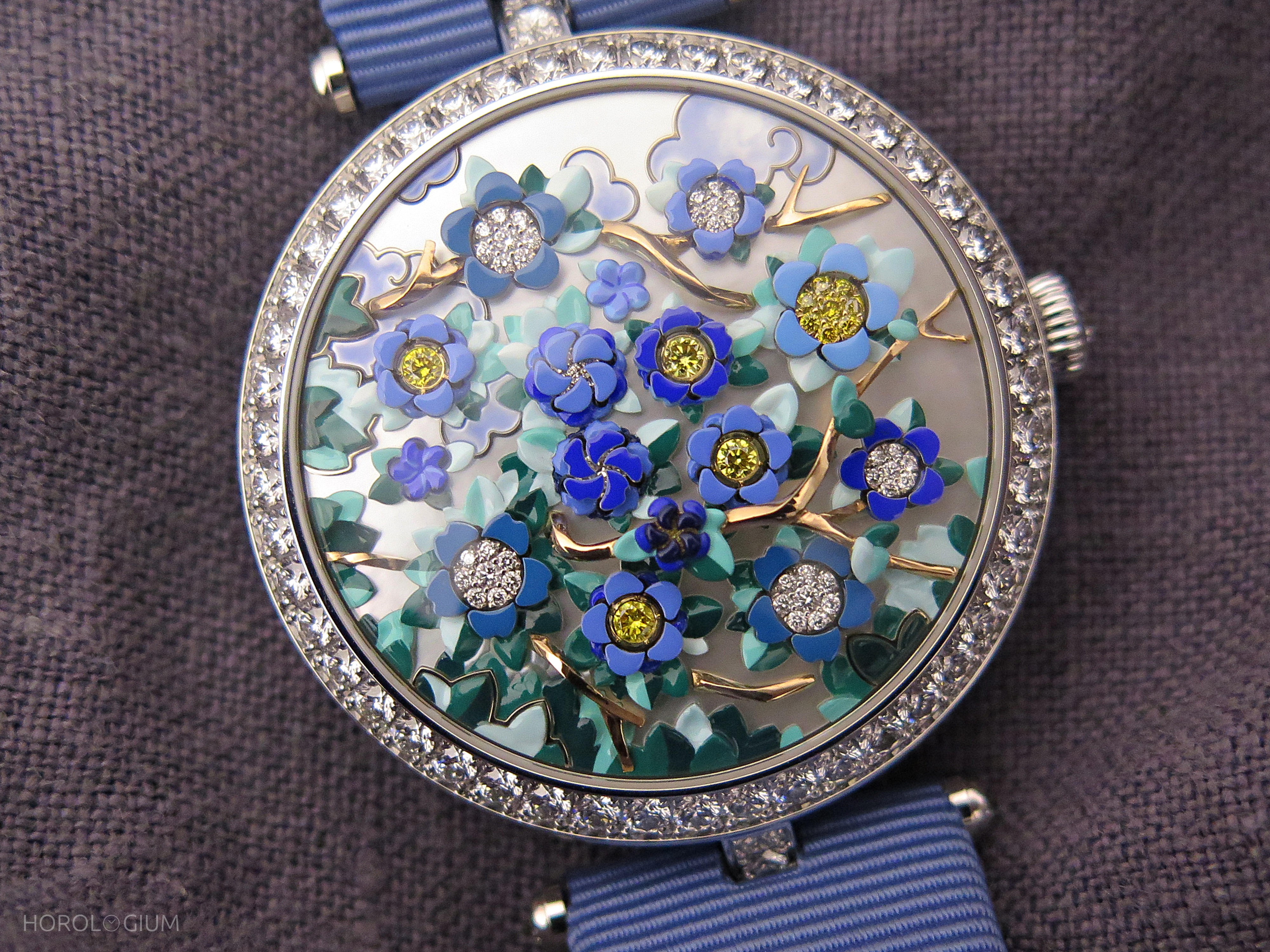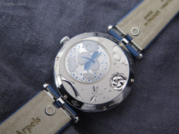There are two new models – the Lady Arpels Heures Florales is in a 38mm white gold case, with white gold bezel, and round diamonds. The dial is white gold, with mother-of-pearl marquetry, sculpted white gold, miniature painting, flowers in white gold, yellow gold, round yellow diamonds, round diamonds, and has sculpted rose gold branches.
