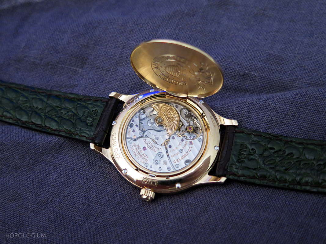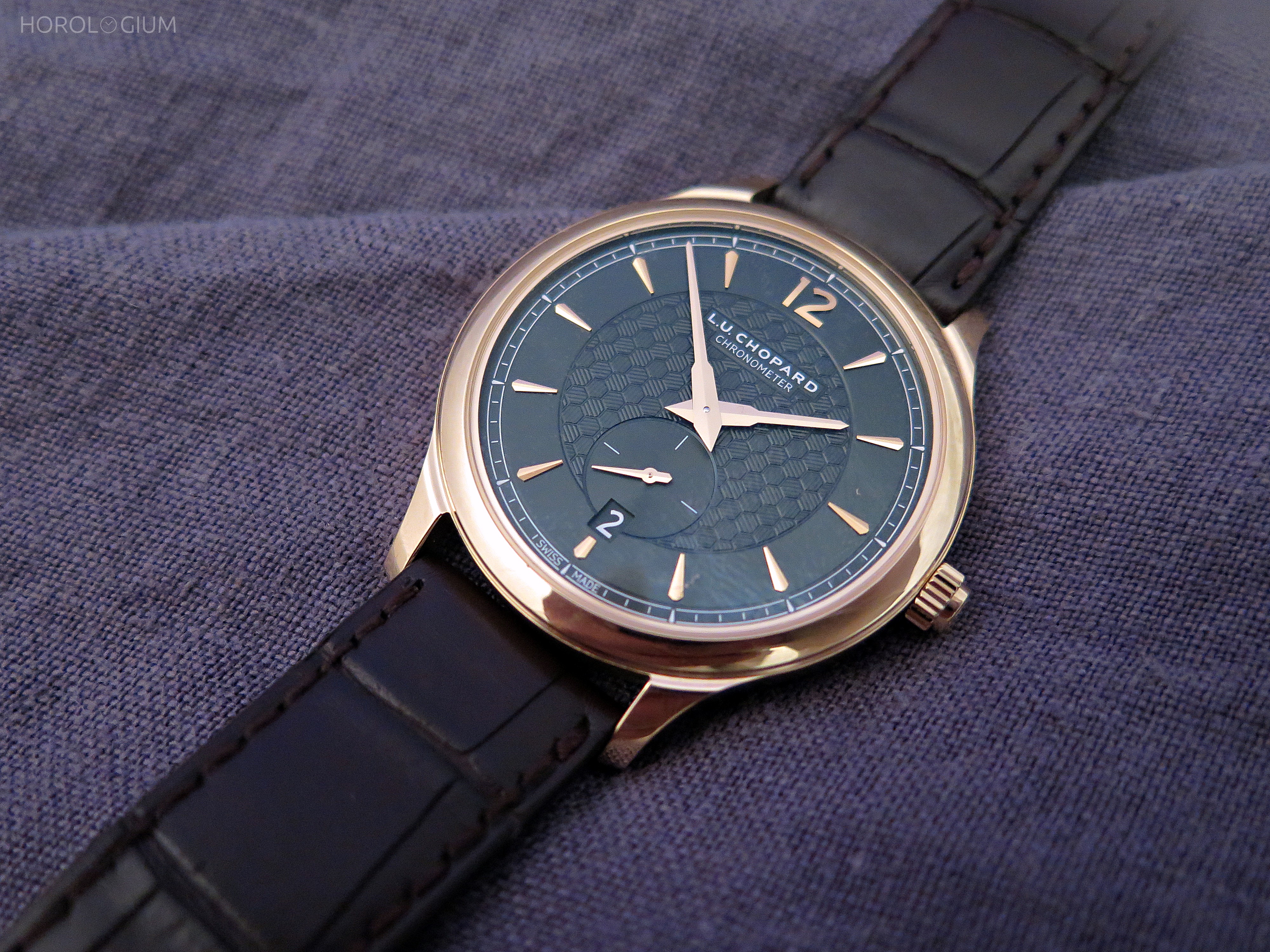 The ‘Officer’ part of the name is also self-evident – it’s the classic ‘officer’ design of an open back protected by a hinged cover that you open by depressing a button in the crown. The inside of the back cover bears the historical Chopard Manufacture logo and the outside has a hand-guilloché honeycomb motif.