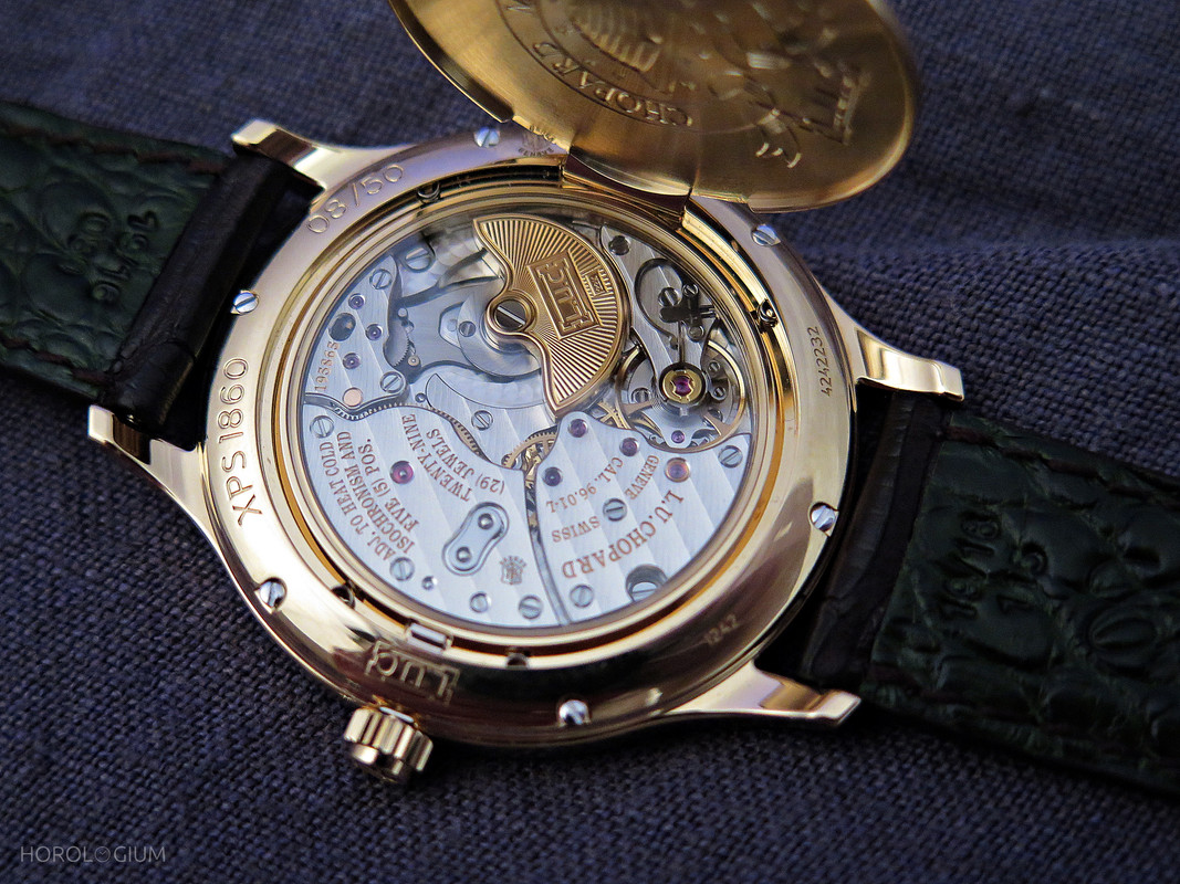 Inside is the automatic in-house COSC-certified Calibre L.U.C 96.01-L which beats at 28,800 VPH and has a power reserve of 65 hours. It has twin barrels, an engraved 22 carat ethical gold micro-rotor, and Côtes de Genève decoration on the bridges.