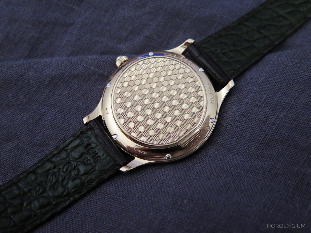 Although its hue is subdued, the new L.U.C. XPS 1860 Officer has a dark green dial (they have called it ‘Forest Green’) in the form of a hand-guilloché gold dial bearing a honeycomb motif in its central area. Its outer section is sunburst satin-brushed and its small seconds sub dial at 6 o’clock is snailed. The honeycomb motif also appears on the outside of the back cover.