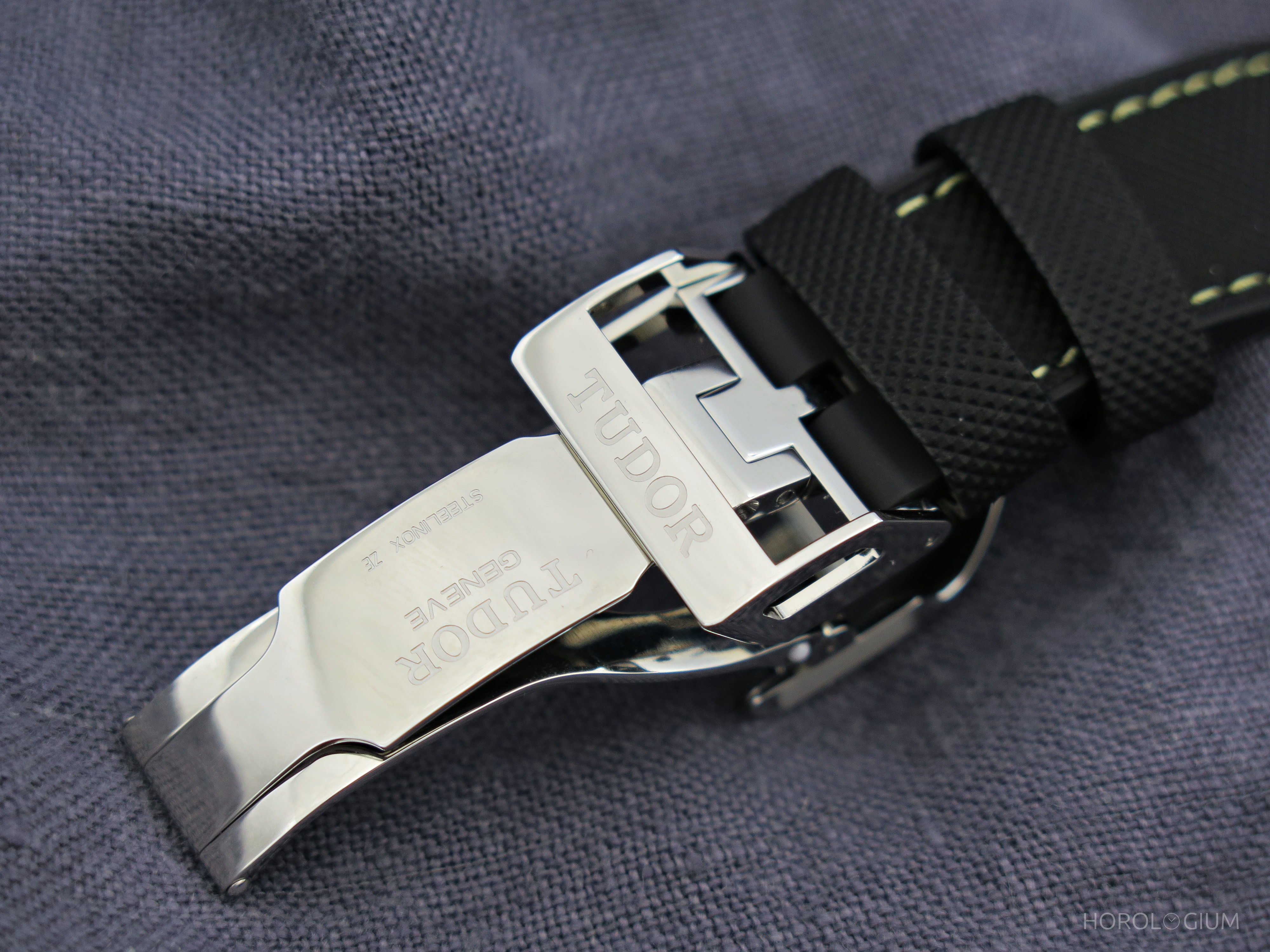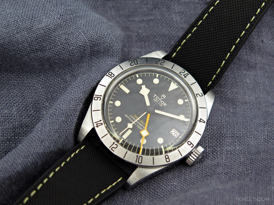 Finally, the Black Bay Pro is also available with a fabric-like hybrid strap in fused rubber and black leather with a folding clasp with contrast yellow stitching (as in these photos).