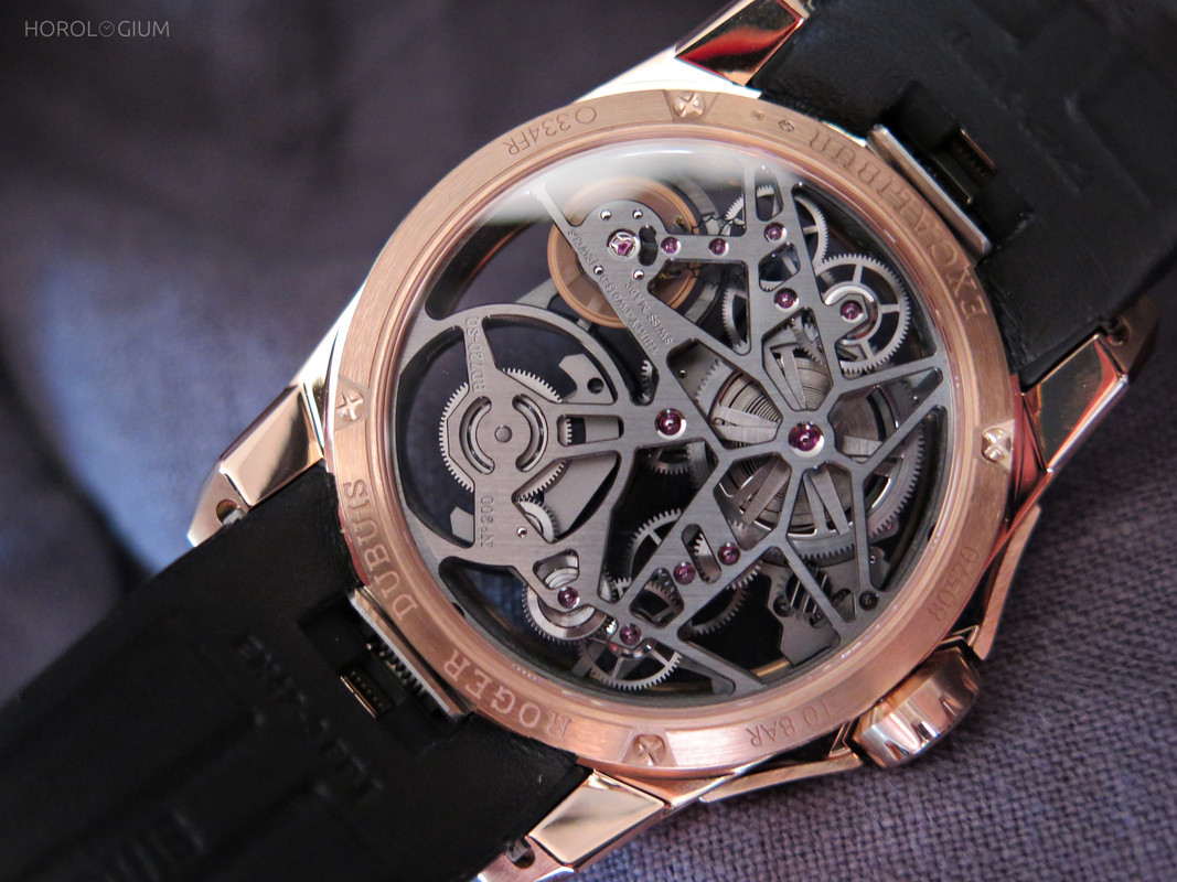 The regular model’s dominant colour on the dial side is grey, with an engraved minute track, polished and pink gold-plated hour markers and gold hands. It comes on a black calf strap which has a Dubuis quick release system.